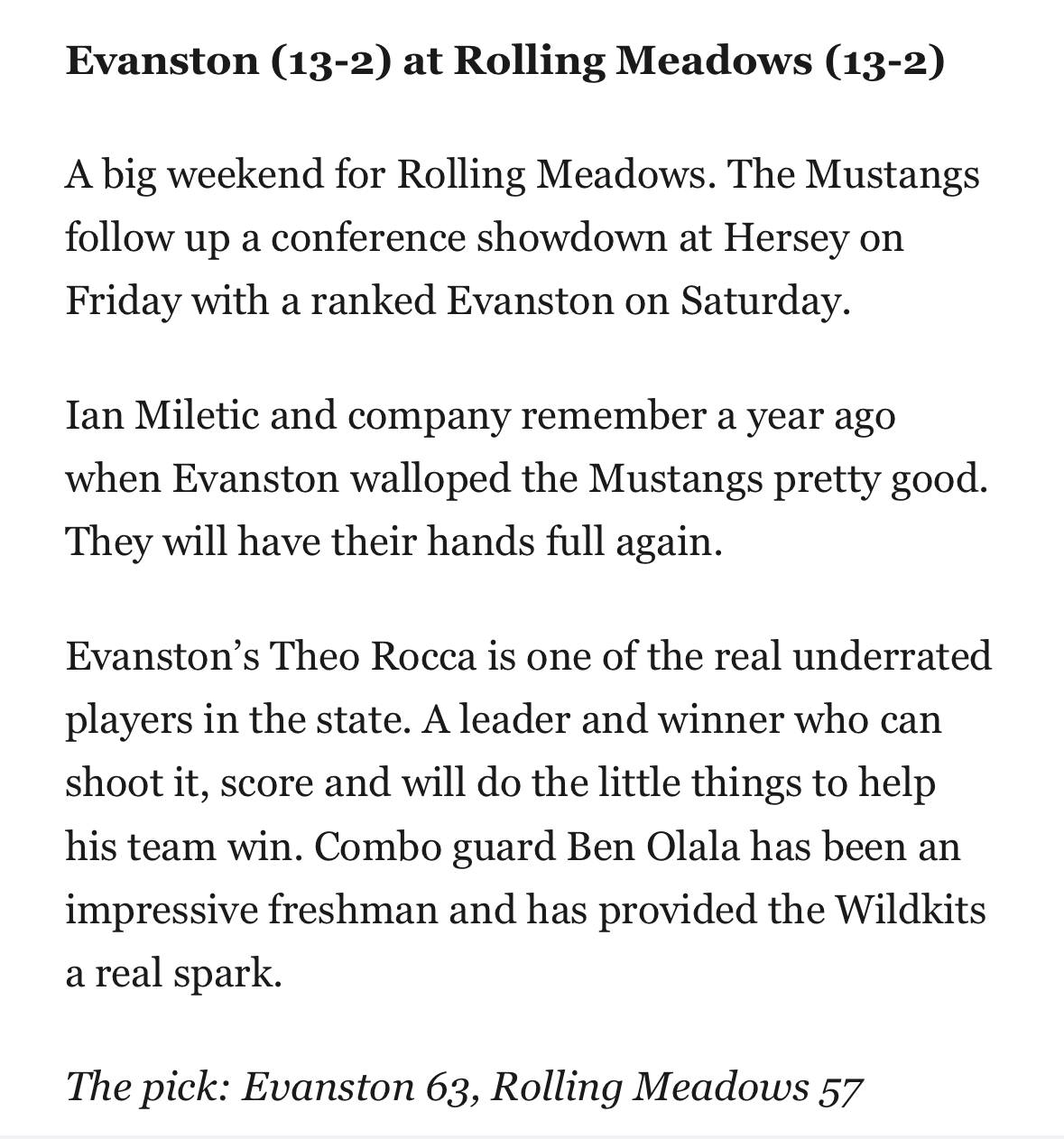 This was a particularly gratifying win for the Mustangs, as one of their two losses came to Evanston earlier in the season. With the win, the Mustangs improve to an impressive 15-2 (4-0 in conference play).